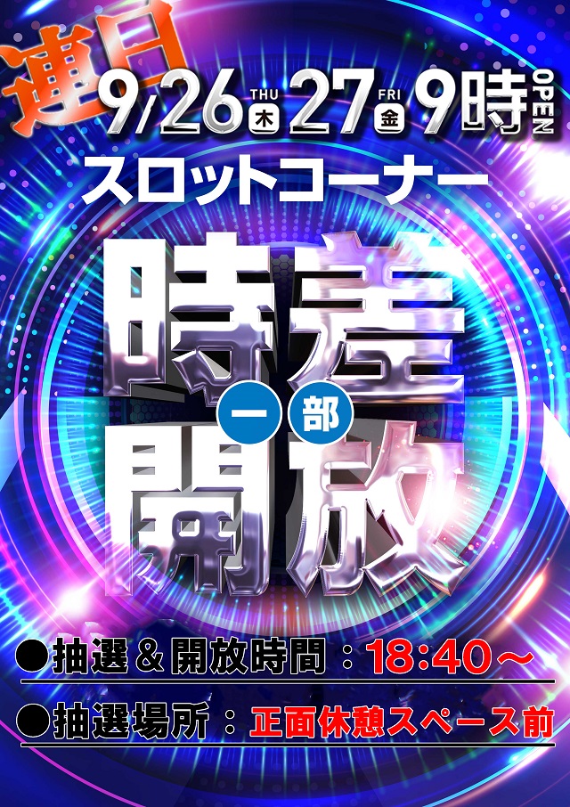 9月26日 (木) 9時開店!スロットコーナー 一部時差開放