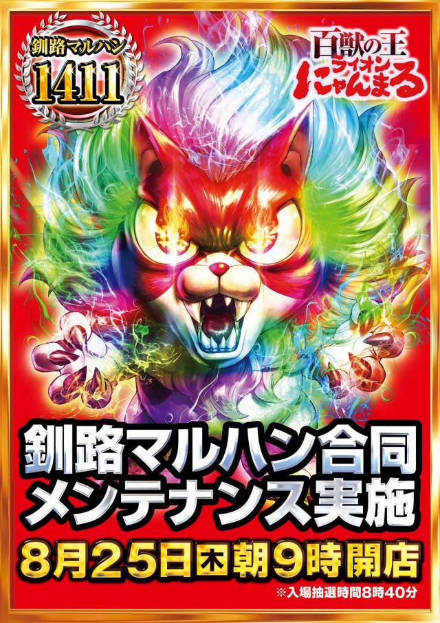 北海道マルハン全店一斉設備メンテナンス22日(月)朝9時開店