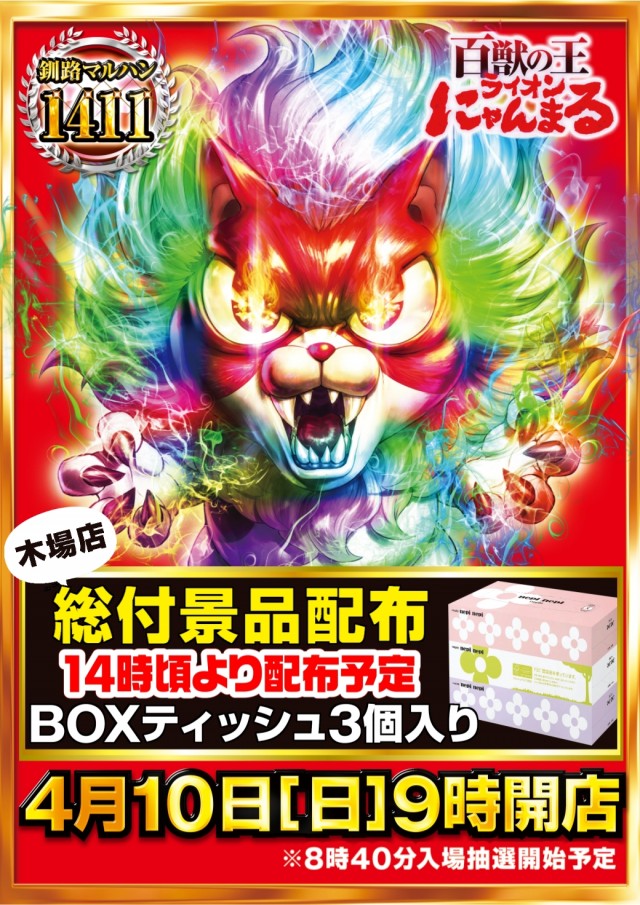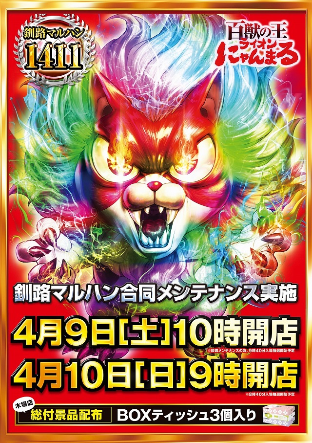 4月9日(土)10時開店 釧路マルハン合同メンテナンス!
