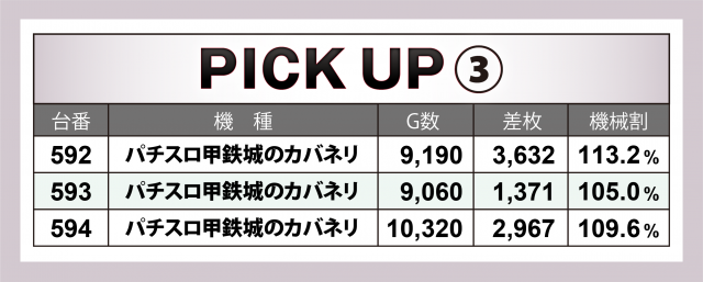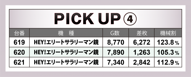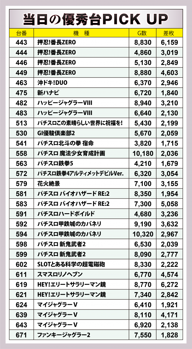 続いては当日好調だった5機種16台をチェック。全ての台が4桁以上の差枚数を達成、中でもハイスコアとなったのが『押忍!番長ZERO』で、+6千枚オーバー台を筆頭に4台トータルで+1万6千枚超えを獲得。さらに『HEY!エリートサラリーマン鏡』は+6千枚突破台を始めに3台の合計で+1万枚を突破。また『パチスロ甲鉄城のカバネリ』では+3千枚クラスが2台、『SLOTとある科学の超電磁砲』は4台合わせて+5千枚間近に迫った。