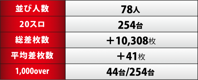 今回、[1000円/46枚] スロ254台は差枚数トータルプラス+10,308枚という成績で終了。これで今までの全3戦では勝ち越しをマーク。一方、1,000overは全体の2割弱ともう少し高いレベルが欲しかった。とは言え、これからの戦績に期待したい同店だけに伸びしろは大きそうで、今後も取材を続けて見守っていきたいものだ。