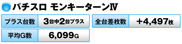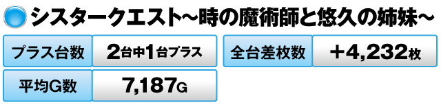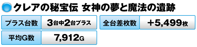 その他、『クレアの秘宝伝 女神の夢と魔法の遺跡』、『パチスロ モンキーターンⅣ』、『パチスロ シスタークエスト 時の魔術師と悠久の姉妹』が注目すべき出玉を見せていた。