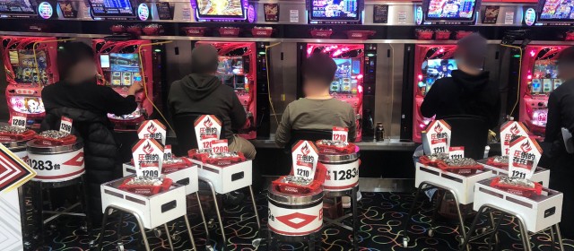 ではこの日の21.73スロの結果を振り返ろう。差枚数プラス千枚以上の優秀30台PICK UP全てが+2千枚以上。この日は何と言っても『押忍!番長3』に注目。写真で示した通り、好出玉が連発。後述する横並びスポット以外にも、+8千枚・7千台が連発しシマがドル箱の洪水状態!