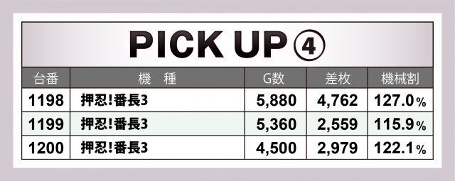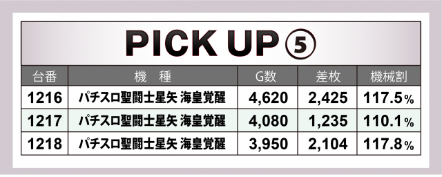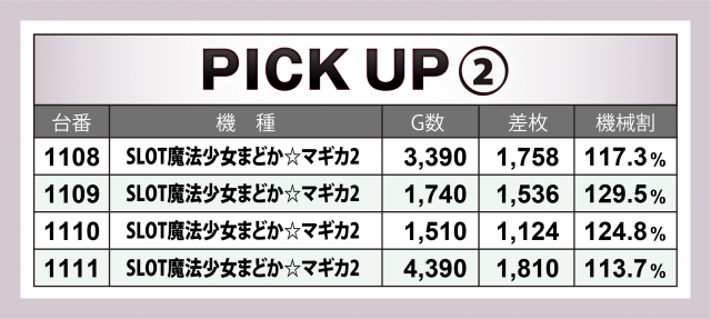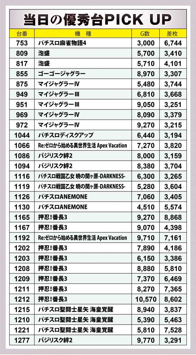 また当日は、4機種の横並び好況スポットが出現。前述した『番長3』の好調は当然のこと、『パチスロ聖闘士星矢 海皇覚醒』は3台全てがプラス&トータルで+6千枚近くの好出玉! また、『マイジャグラーⅢ』『SLOT魔法少女まどか☆マギカ2』は稼働少なめだったが両機種共に全てがプラス台になった。