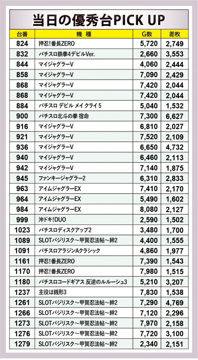 上表をご覧の通り、『押忍!番長ZERO』『SLOTバジリスク~甲賀忍法帖~絆2』『マイジャグラーV』といった人気かつ定番機種の名前が多く名を連ねている。これらが一丸となって熱気と活気を形成しつつ、『パチスロ鉄拳4デビルVer.』『パチスロコードギアス 反逆のルルーシュ3』から3千枚OVERが発生!さらに『パチスロ北斗の拳 宿命』では6,627枚のプラス差枚が記録されており、各機種からしっかりと熱量を感じ取ることができた。