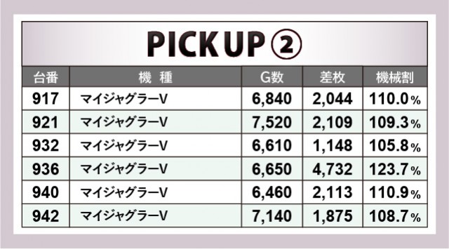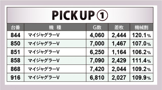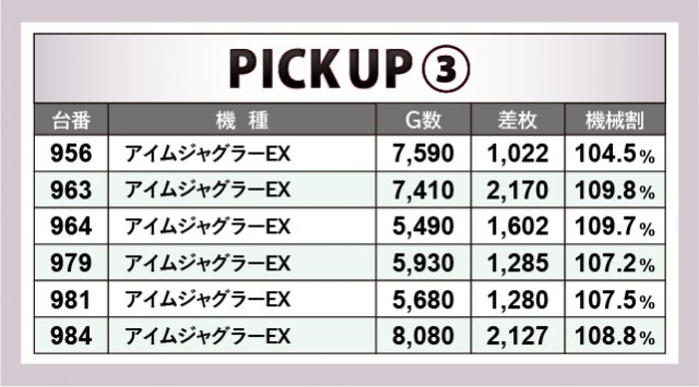 『マイジャグラーV』ではゲーム数・差枚数がともに良好な数字を記録する台が多々見られる。936番台では+4,732枚・6,650回転という目立った活躍が見られ、当日でもトップクラスの数字が打ち立てられた。最多設置を誇る『アイムジャグラーEX』でもコンスタントな大当りを確認できるデータが刻まれており、『ジャグラー』の島はGOGOランプの光で明るく照らされていたことだろう。