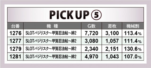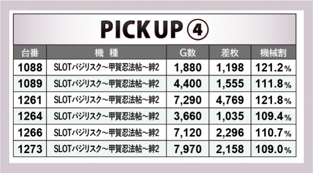 一方でAT機からは『SLOTバジリスク~甲賀忍法帖~絆2』に注目したい。こちらでもゲーム数・差枚数から右肩上がりのグラフを描いている様子を想像でき、自信を持ってレバーを叩けたファンの姿が想像できる。1261番台の+4,769枚・7,290回転が代表されるように、各台で安定した挙動が見られたことで、ファンは有意義な時間を過ごせたはずだ。