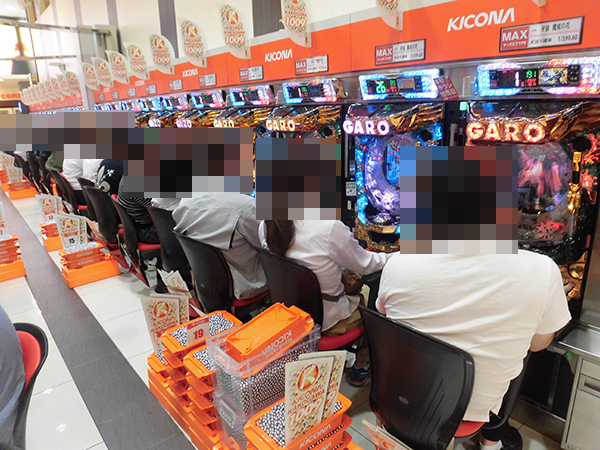 14時を過ぎた頃の4円パチンコでは、MAXタイプの「CR牙狼 魔戒ノ花」が朝イチからの人気をキープ。
