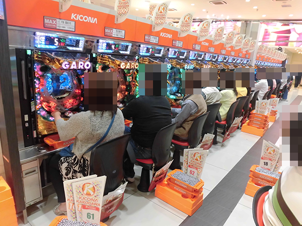14時を過ぎた頃の4円パチンコでは、前日と同様に「CR牙狼 魔戒ノ花」と「ぱちんこCR北斗の拳6 拳王」が盛況。