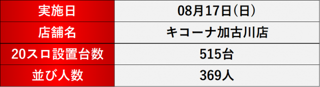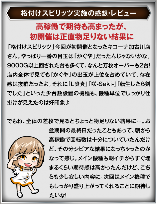 8月17日(日) キコーナ加古川店にて、DMMぱちタウンの「格付けスピリッツ」を実施。