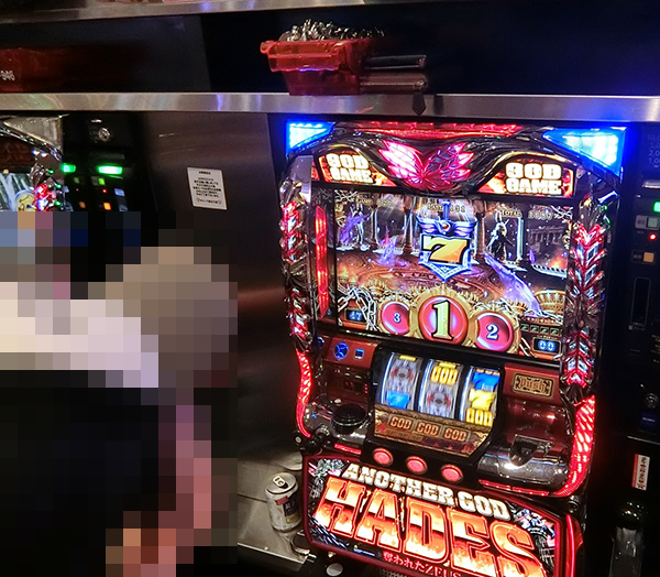 「アナザーゴッドハーデス」にて、理想的ともいえる展開で遊技を楽しむプレイヤーのにこやかな表情を確認。