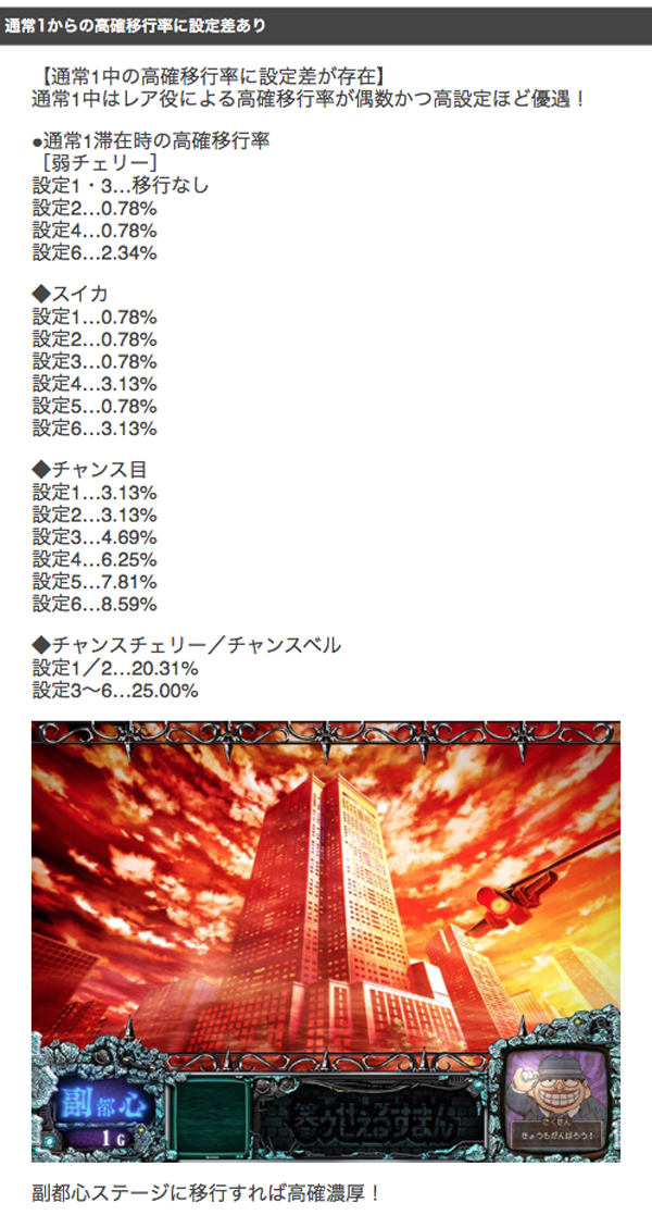 通常1滞在時のレア役からの高確移行率にも設定差があり、偶数かつ高設定ほど高確に移行しやすい。