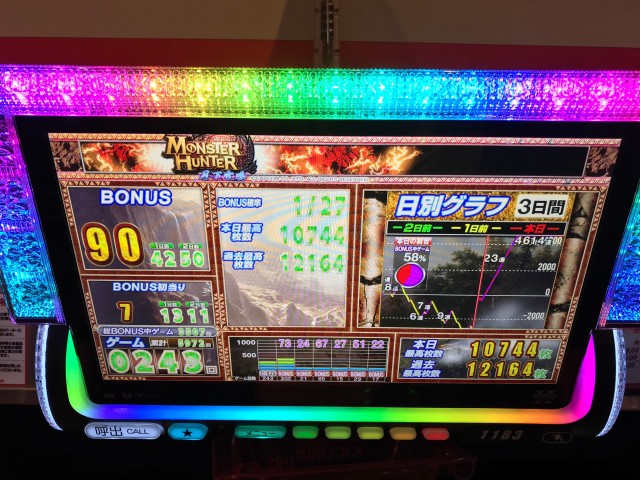 『パチスロ モンスターハンター 月下雷鳴』は、6台中5台がプラスで全台差枚数が+15,054枚という、まさにG級というべき好結果をあげた。