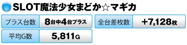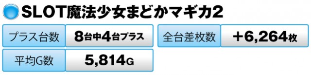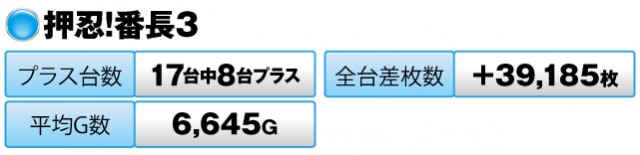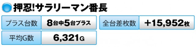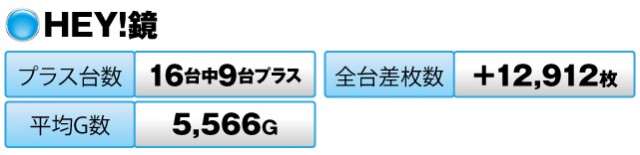 『押忍!サラリーマン番長』が8台中5台プラスで全台差枚数が+15,952枚、『HEY!鏡』が16台中9台がプラスで全台差枚数が+12,912枚と、いずれも半数以上の台がプラス&差枚+1万越えを達成している。
