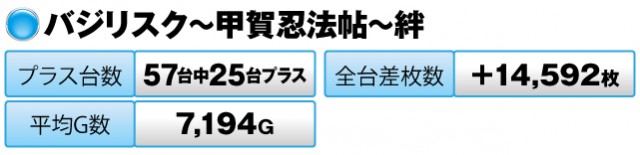 現在、ホールではトップクラスの人気と台数を誇る『バジリスク~甲賀忍法帖~絆』は、57台という大所帯ながら半数近い25台がプラスを計上し、全台差枚数も+14,592枚を記録。