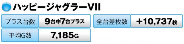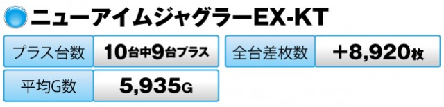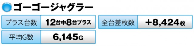 『ニューアイムジャグラーEX-KT』が10台中9台プラスで全台差枚数が+8,920枚、『ハッピージャグラーⅦ』が9台中7台プラスで全台差枚数が+10,737枚、そして『ゴーゴージャグラー』が12台中8台プラスで全台差枚数が+8,424枚という結果に。