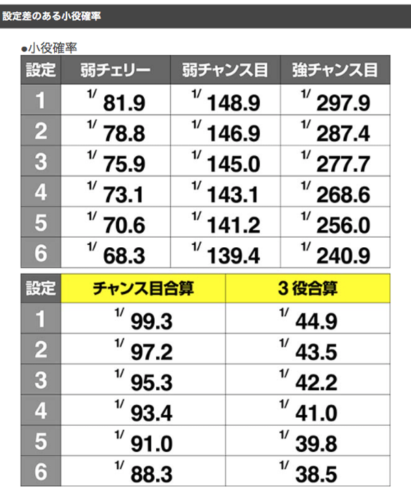 高設定ほど、弱チェリーとチャンス目の確率が高い。