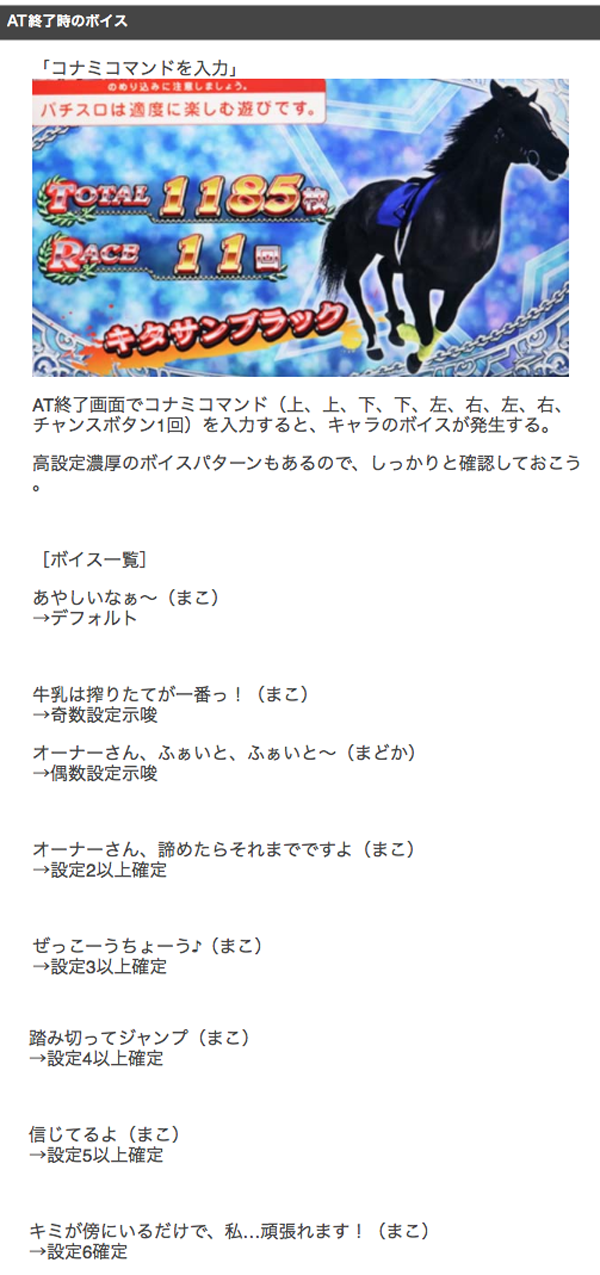 AT終了画面でコナミコマンド(順番は上上下下左右左右チャンスボタン1回)を入力すると発生するボイスにも設定示唆の要素がある。高設定が濃厚となるパターンを把握しておきたい。