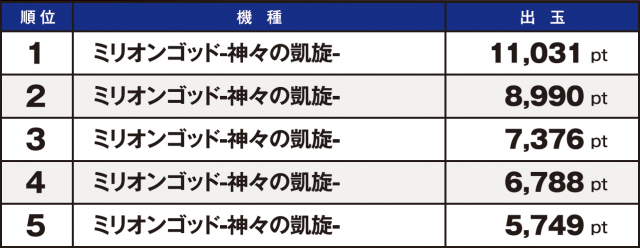 中でも『ミリオンゴッド-神々の凱旋-』は、最終差枚で約1万1千ptを筆頭に怪記録を量産。旧高純増機の中ではまだ猶予がある大人気機種とあってか、今後もまだまだ狙い目として、その勇姿が拝めそうだ。