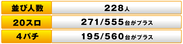 パチスロ全体では、555台のうち半数近い271台がプラスで、トータルの差枚数は+72,811枚という結果になった。