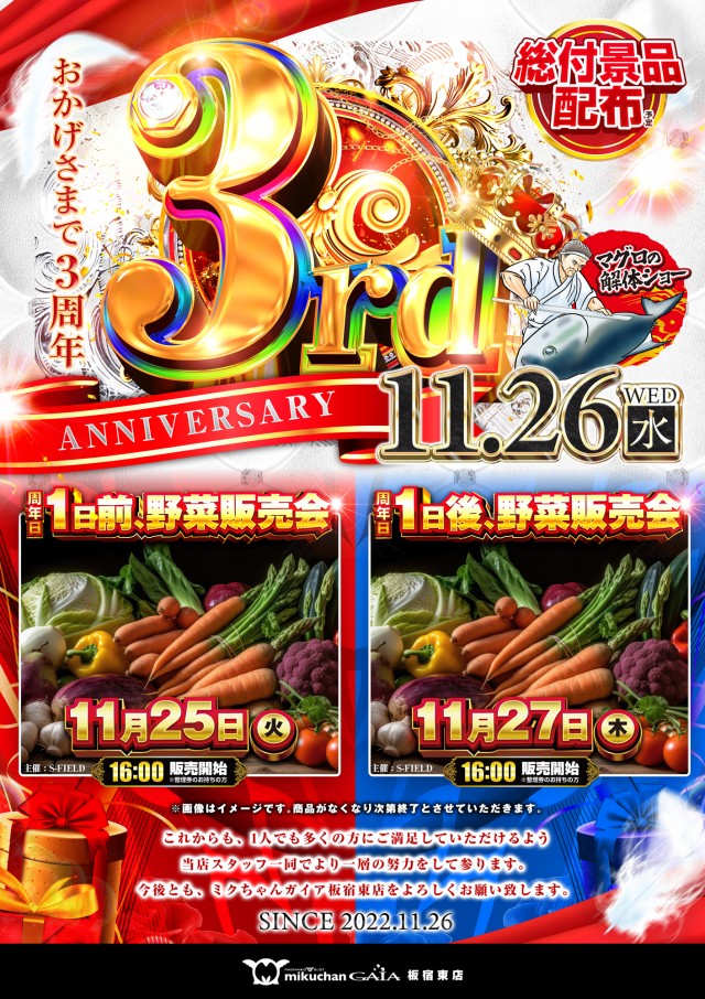おかげさまで11月26日【☆★3周年★☆】総付景品配布!!