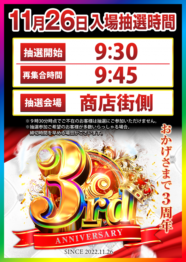 おかげさまで3周年!この後9:30より優先入場抽選開始!