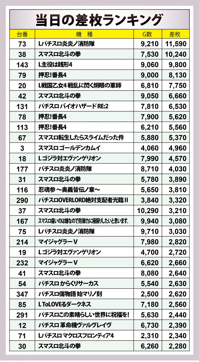 ※差枚数順に掲載しています。