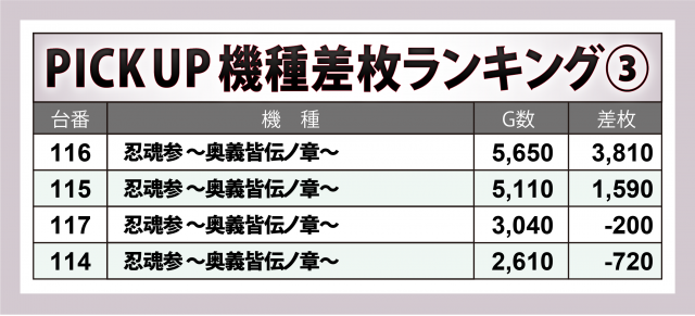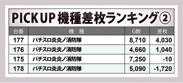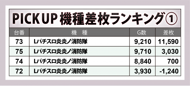 この中では『Lパチスロ炎炎ノ消防隊』が+12,000枚に迫る差枚数をマーク、『パチスロ バイオハザード RE:2』が+6,500枚超、『パチスロ炎炎ノ消防隊』『忍魂参 ~奥義皆伝ノ章~』には+4,000枚クラスが1台ずつと、各々好成績が続出した。