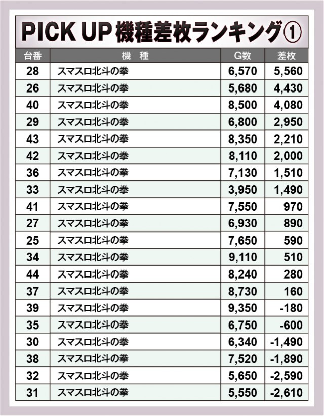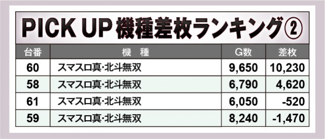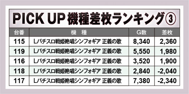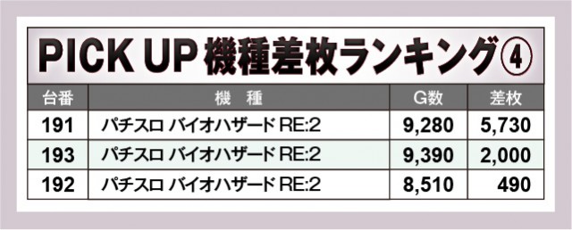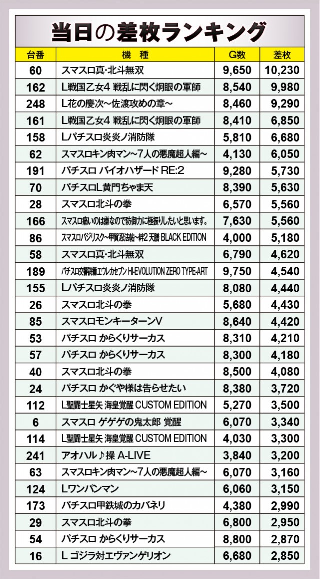 上表の4機種はいずれも安定感のあるパフォーマンスを披露していたと言える。大きなマイナスが少なく、それでいて『パチスロ バイオハザード RE:2』は全台プラス差枚数を達成しているのが鮮烈だ。『Lパチスロ戦姫絶唱シンフォギア 正義の歌』も派手さこそないがコンスタントに大当りを積み重ね、『スマスロ北斗の拳』『スマスロ真・北斗無双』も高い活気と熱気を披露していたと言えよう。