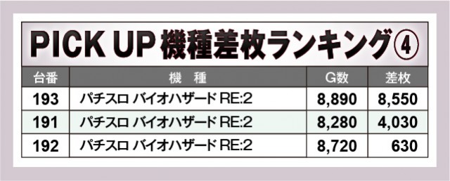 上表の優秀機種はいずれも高い回転数をマークしており、具体的には開店前から閉店までじっくりと打ち込まれた様子が顕著だ。特筆すべきは『パチスロ バイオハザード RE:2』で、全台プラス差枚数を達成しているのが目に焼きつく。もちろん万枚OVERを達成した『スマスロ北斗の拳』『Lパチスロ炎炎ノ消防隊』の存在も見逃せず、これら優秀機種たちが一丸となって盛り上がりを形成していたと言える。