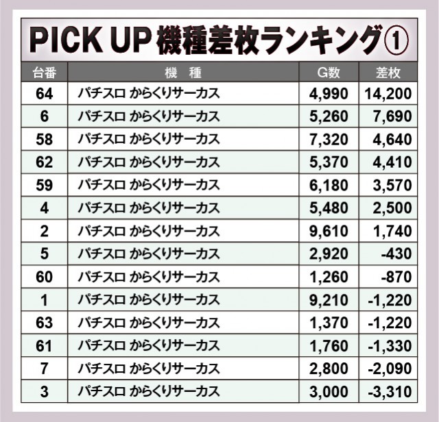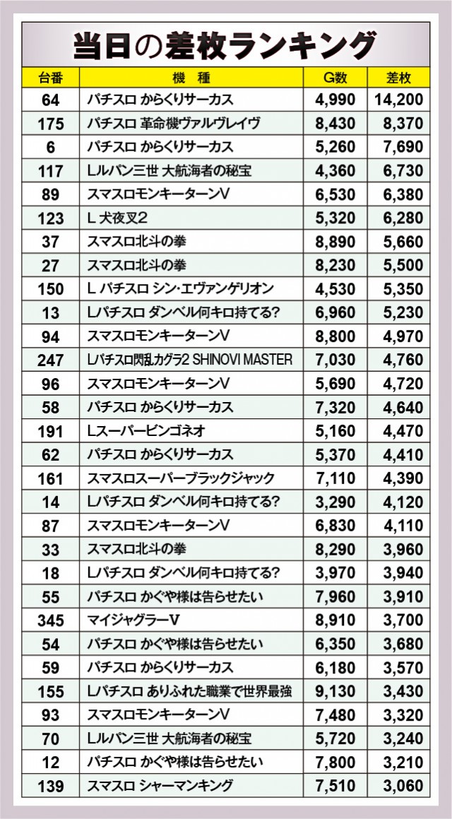 上表は3,000枚OVERから名を連ねており、館内は大きな熱気に包まれていたのが手に取るように分かる。そのなかで『パチスロ からくりサーカス』が万枚OVERを達成し、その後ろには『パチスロ 革命機ヴァルヴレイヴ』が8,000枚OVERを築くなど、大台突破台が数多く見られるのも鮮烈だ。新台『スマスロスーパーブラックジャック』『Lパチスロ ありふれた職業で世界最強』らの活躍も確認でき、今後の展開が楽しみな内容となっている。