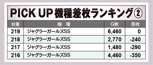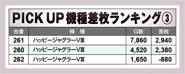 『パチスロ からくりサーカス』は万枚OVERの活躍だけでなく、9,000回転台をマークする台が複数見られるなど、活気と熱気に溢れる状況に。現役屈指の出玉性能を存分に発揮しては、半数以上でプラス差枚数を築いているのも特筆すべきポイントである。そして『ジャグラーガールズSS』『ハッピージャグラーVⅢ』の存在も見逃せず、ポテンシャルを秘めていた様子はしっかりとファンに察知されていたようだ。