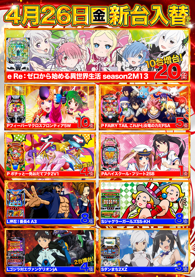 ★4月26日(金)新台入替★9機種49台導入予定!