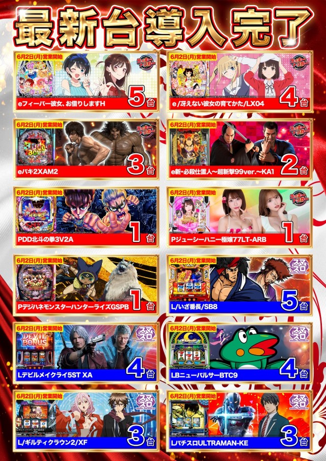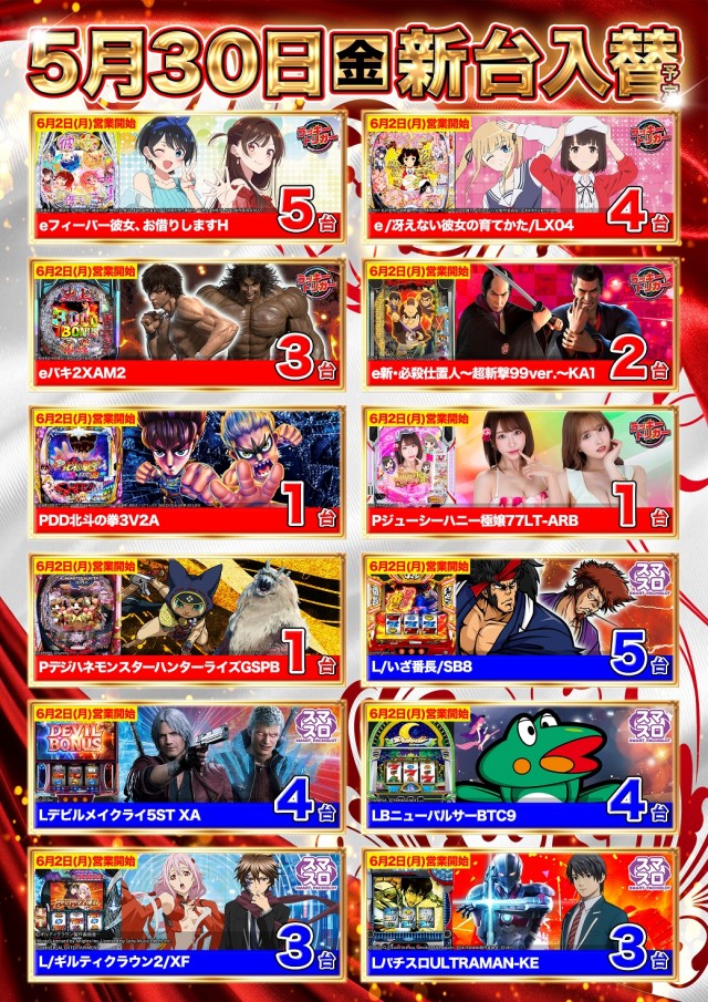 ★5月30日(金)新台入替★全12機種36台導入予定!
