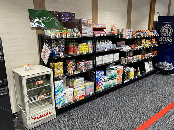 景品コーナーには食品類・酒類・日用品など多彩なアイテムが並んでおり、プレイヤーたちの興味を引いていた。