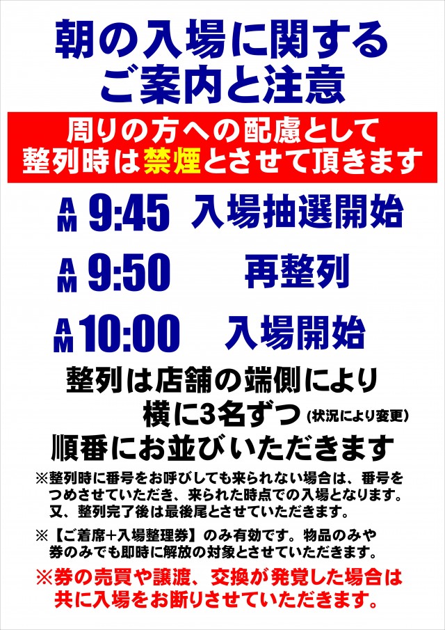 店舗入口前で9:30より開始させていただきます。再整列は9:50となります。 |