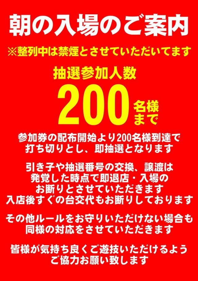 店舗入口前で9:30より開始させていただきます。再整列は9:50となります。 |
