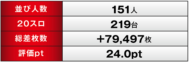 今回のスロ総差枚は、+79,497枚。凄まじい結果である。これを20スロ全219台で割ると、その平均差枚は+363枚。まさかここまでやってくれるとはさすが「ミクちゃん」グループ屈指の人気店。こうなると、ますます次回の実施が楽しみで仕方ない!