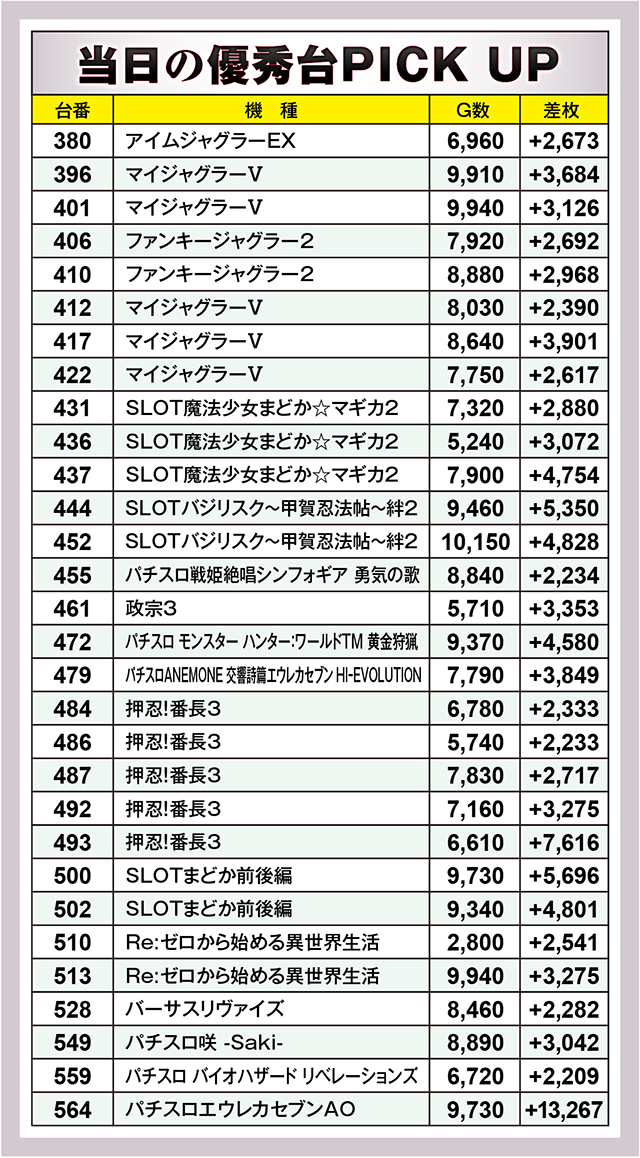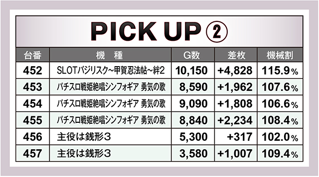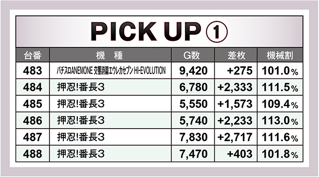 『パチスロANEMONE 交響詩篇エウレカセブン HI-EVOLUTION』と『押忍!番長3』の6台並びは、誰の目にも明らかな優秀台の塊。6台横並びでプラっている光景は実に壮大であった。またPICK UP②も6台並びでプラス値をマークしており、こちらの塊も大きな注目を集めていたぞ!