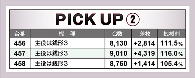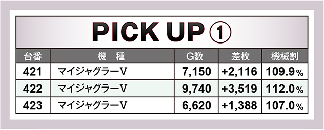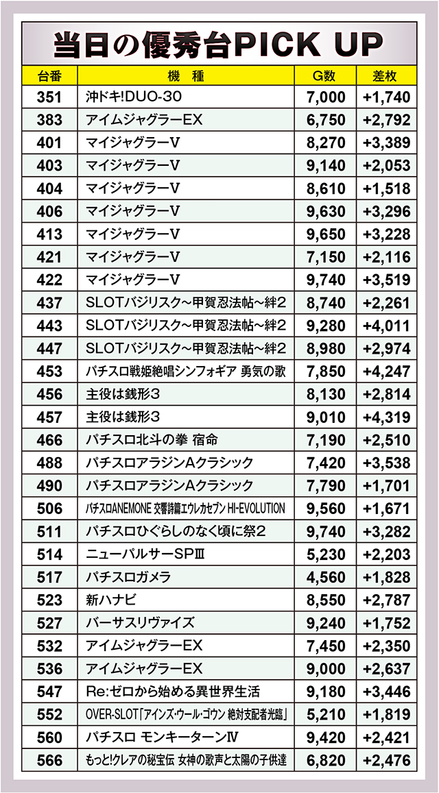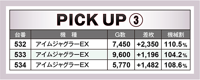 パチスロコーナーでは、3台並びでプラス値を刻んでいる機種を確認。『マイジャグラーⅤ』『アイムジャグラーEX』『主役は銭形3』の3機種である。いずれも平均差枚は+1,500枚を上回っており、優秀台が固まっていたのは間違いないだろう。