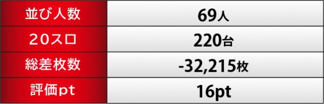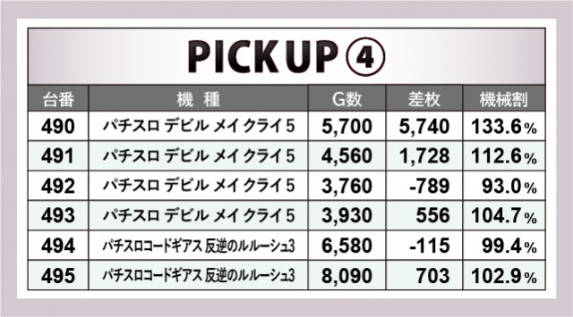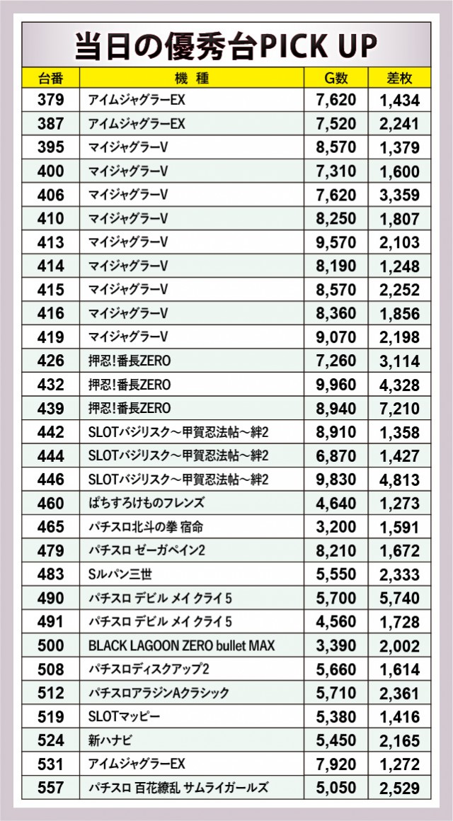 人気機種の活躍が目立った内容で、『押忍!番長ZERO』439番台+7,210枚という記録が圧巻のひと言に尽きる。続いて『パチスロ デビル メイ クライ 5』490番台+5,740枚が発生し、その他にも4千枚OVERを達成する台が見られた。人気機種ではゲーム数も多く消化されており、多くのファンが信頼を寄せている様子が如実に窺える。