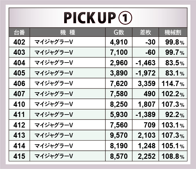 老若男女問わず愛される『マイジャグラーV』にて、2箇所の横並び好況スポットを確認できた。差枚数がプラスの台では消化されているゲーム数が多く、相応に手ごたえを感じられた様子が顕著だと言える。そのためマイナスを記録している台も、より多くの回転数を重ねることで、プラスに転じた可能性が十分にあったはずだ…!
