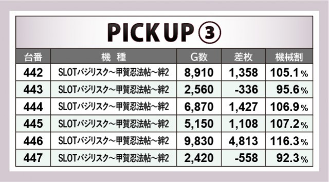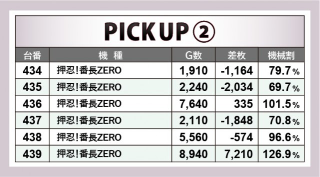 AT機の中心である『押忍!番長ZERO』『SLOTバジリスク~甲賀忍法帖~絆2』でも、同様のことが言えるかもしれない。こちらでも回転数が多い台でしっかりと記録が残されており、ファンは十分にポテンシャルを感じ取れなかったと想像できる。『押忍!番長ZERO』は434・435・437番台、『SLOTバジリスク~甲賀忍法帖~絆2』では443・447番台が該当し、もっと粘り強く戦ってほしいと感じずにはいられない内容だ。