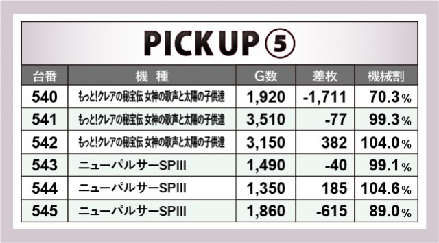 少数精鋭の『パチスロ デビル メイ クライ 5』と『パチスロコードギアス 反逆のルルーシュ3』、『もっと!クレアの秘宝伝 女神の歌声と太陽の子供達』『ニューパルサーSPⅢ』もまた、好況スポットを確認できた場所である。後者のノーマル/Aタイプ機はポテンシャルを感じられた一角で、やはり回転数不足が悔やまれるばかり。『パチスロ デビル メイ クライ 5』のような爆発があったかもしれないだけに、次回こそは時間の許す限りレバーを叩き続けてほしいものだ。
