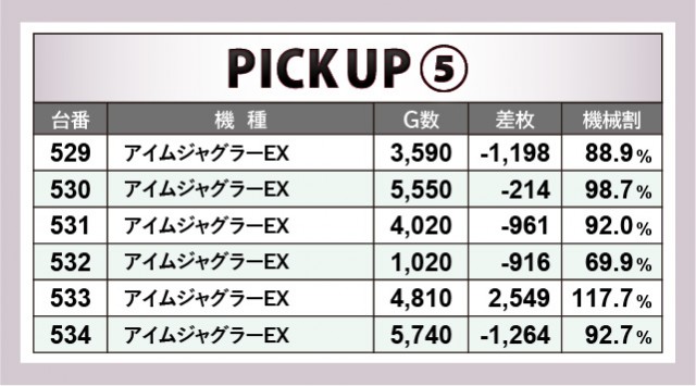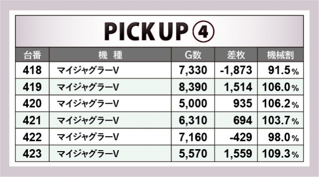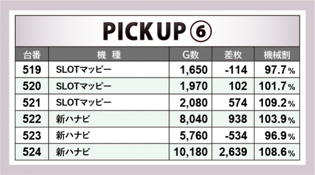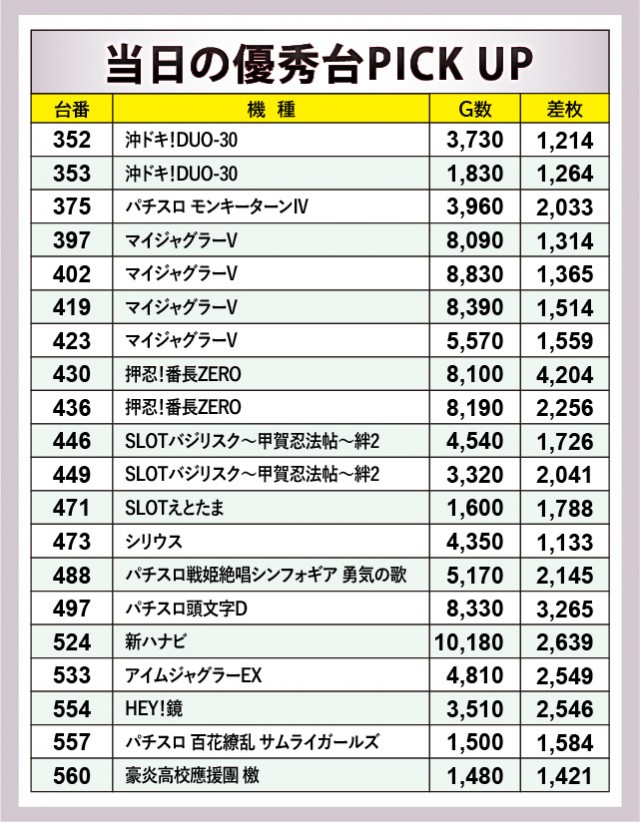 優秀台をピックアップすると、AT機から熱気が放たれていた様子が窺える。『押忍!番長ZERO』430番台+4,204枚という記録が証明しており、さらに消化されたゲーム数も8千回転を超えていた。また『マイジャグラーV』も然ることながら、『新ハナビ』にて10,180回転も遊技されるなど、確かな手ごたえを感じられる状況だったのもポイントだ。