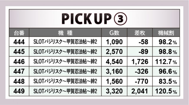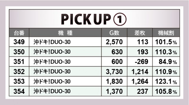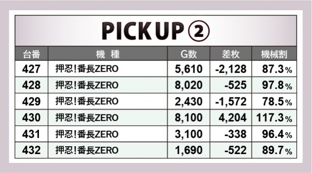 『沖ドキ!DUO-30』『押忍!番長ZERO』『SLOTバジリスク~甲賀忍法帖~絆2』の人気機種群は、6台横並びの好況スポットを確認できた。特に秀でた盛り上がりを見せていたのが『押忍!番長ZERO』で、430番台+4,204枚という記録が突出している。他の機種でも粘り強く戦う姿勢が見られ、惜しくもプラス差枚に届かなかったのが悔やまれるばかりだ。