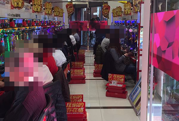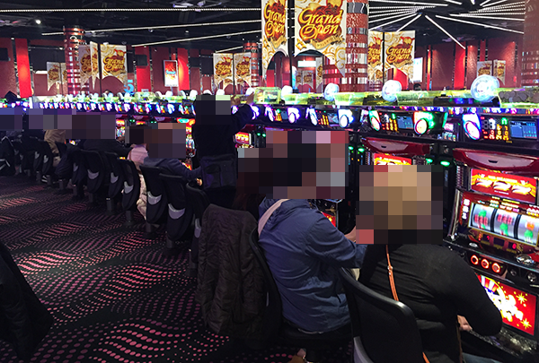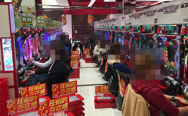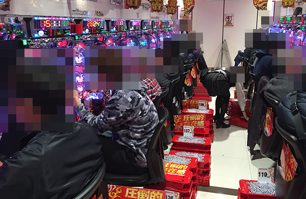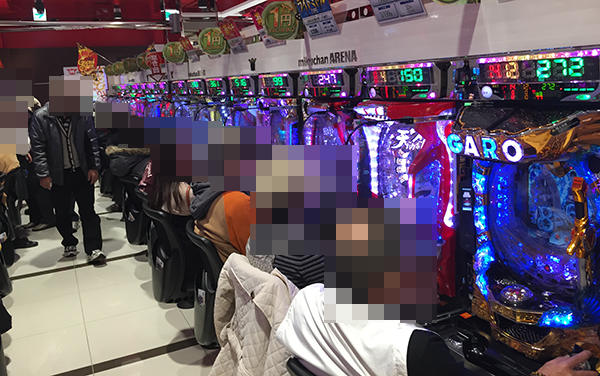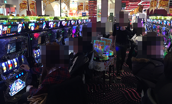 15時頃の4円パチンコは海物語シリーズが盛況で、なかでも新台の「CRスーパー海物語IN JAPAN」には、空き台もほとんど見当たらない。稼働率の高さだけでなく、笑顔のプレイヤーが多かったことも印象的。表情からは満足のいく遊技ができていることも伝わってきた。