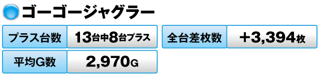 『ゴーゴージャグラー』は13台中8台がプラスで全台差枚数が+3,394枚。