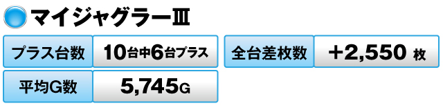 『マイジャグラーⅢ』は10台中6台がプラスで全台差枚数が+2,550枚。