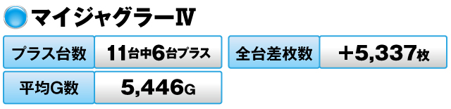 『マイジャグラーⅣ』は11台中6台がプラスで全台差枚数が+5,337枚。